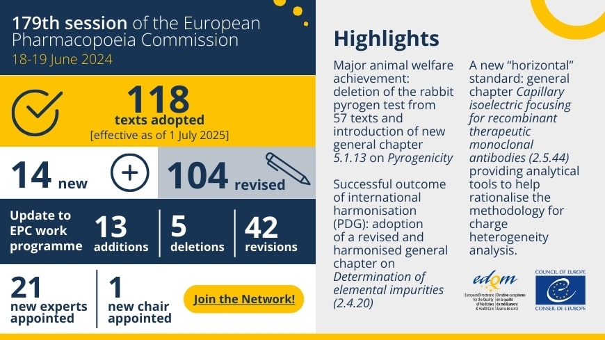 At its 179th session in June 2024, as the outcome of a broad exercise aiming at the complete removal of the RPT from the European Pharmacopoeia (Ph. Eur.), the Ph. Eur. Commission adopted 57 revised texts from which the RPT has been deleted, together with a new general chapter on Pyrogenicity (5.1.13), marking the end of the RPT era in the Ph. Eur. A list of these texts can be found here.
