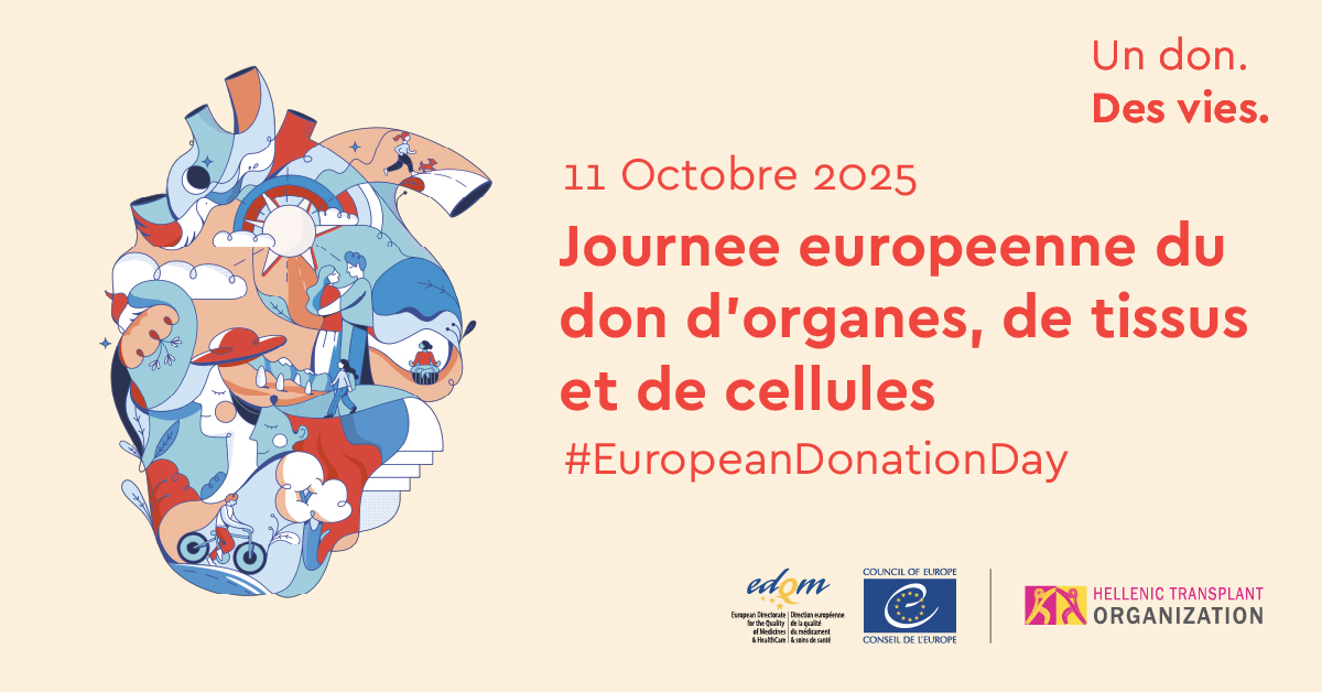 Cette année, la Journée européenne du don (EDD) sera célébrée du 10 au 12 octobre et accueillie par la Grèce, en collaboration avec l'organisation grecque de la transplantation (EOM). L’édition 2025 sera ponctuée de multiples événements à Kalamata et à Athènes, avec pour slogan :